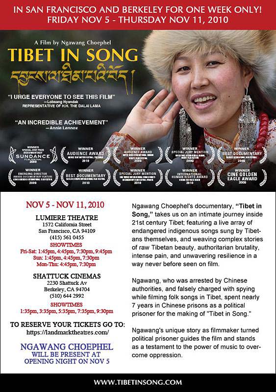 Screening of Tibet In Song at the Landmark Lumiere in San Francisco and the Landmark Shattuck Cinemas in Berkeley. |